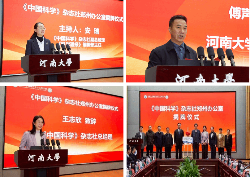 《中国科学》杂志社副总经理、《科学通报》编辑部主任安瑞主持揭牌仪式。河南大别山森林生态系统国家野外科学观测研究站站长傅声雷致辞,并对郑州办公室的成立表示热烈祝贺。他指出,办公室的成立将为河南大学乃至中原地区科研工作者搭建通往国际学术前沿的“直通车”,学校将以此次合作为新起点,依托办公室这一纽带,深耕学术、协同创新,共同服务国家科技创新战略,助力中原地区高质量发展与“双一流”建设。