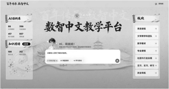 面对教学资源分散、利用率低的普遍问题,学院不止步于建设单一课程资源库,而是打造集资源整合、深度互动、协同创造于一体的数智中文教学平台。该平台汇聚了百年经典教材库、数智化特色课程群、行走的课堂实践资源库、文学跨学科研究成果库、师资团队智库等核心模块。