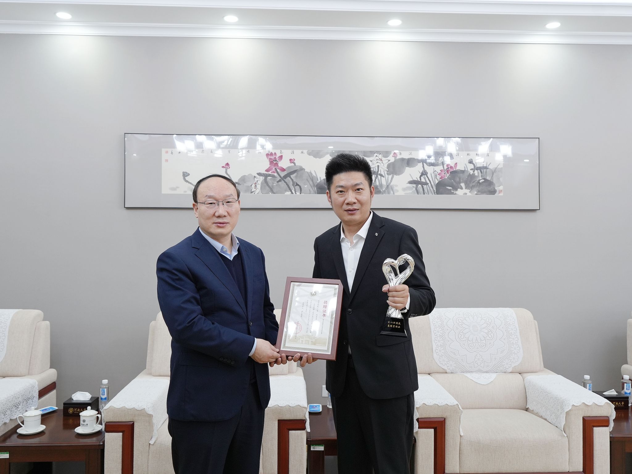 1月16日,北京大优教育科技研究院向河南大学教育发展基金会捐赠仪式在郑州龙子湖校区友兰学堂中楼502会议室举行。捐赠方代表、北京大优教育科技研究院董事长、我校美术学院2008届校友杨立成,以及副总裁李中皇一行,以实际行动反哺母校。校长张锁江院士在仪式前会见杨立成校友一行,围绕学科建设、国际交流、人才培养等深入交流。
